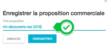 Saisissez un titre qui vous permettra de retrouver facilement cette proposition à l’avenir : "Vin découverte mai 2018" puis cliquez sur ENREGISTRER.